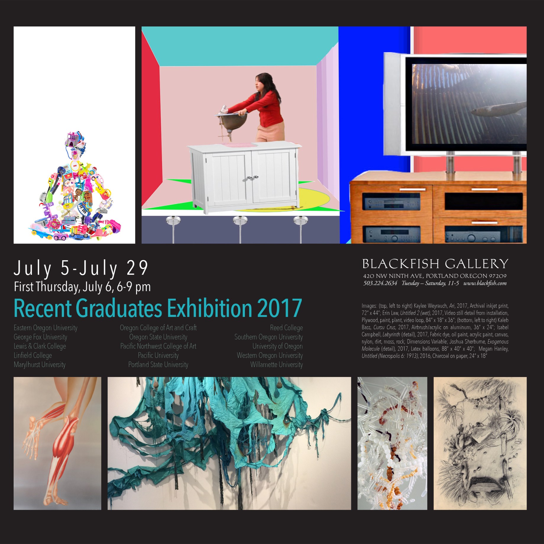 July brings the 22nd edition of the Recent Graduates show to Blackfish Gallery. It’s an anticipated summer event that showcases some of Oregon’s most gifted new makers. Thirty graduating artists, selected by the art faculties of the respective schools, present work in photography, sculpture, painting, video and more. The show offers an opportunity to viewers to see what themes resonate with millennial artists, and get a sense of how the art object may be altered going forward.